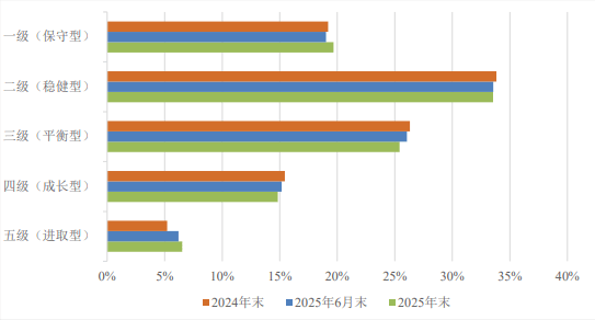 (持有理财产品的投资者数量变化趋势,资料来源:银行业理财登记托管中心) 从结构上看,截至2025年末,理财市场仍以个人投资者为主,数量为1.41亿个,占比98.64%;机构投资者数量为194万个,占比1.36%。 从理财产品个人投资者风险偏好看,数量最多的仍是风险偏好为二级(稳健型)的投资者,占比33.54%。风险偏好为一级(保守型)和五级(进取型)的个人投资者数量占比较年初有所增加,分别增加0.48和1.30个百分点。