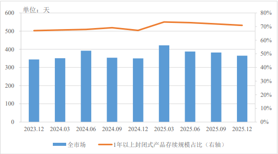 (理财产品存续情况,资料来源:银行业理财登记托管中心) 对此,国信证券(002736)指出,在利率市场化深化、存款利率持续下行的宏观背景下,银行理财稳健和低波的特性使其成为居民储蓄的重要流向。2025 年理财市场存续规模逆势增长11.15%,达到33.29 万亿元。这表明尽管收益率承压,但客户对于超越存款收益、同时波动率低于基金的净值化产品有着巨大且刚性的配置需求。理财业务已成为银行维系客户、应对金融脱媒的关键抓手。 展望2026年,光大证券(601788)金融业首席分析师王一峰认为,伴随存量高息定期存款陆续到期,比价效应下存款“脱媒”仍是理财扩张的有力支撑,中性预估规模增量为3万亿元左右,到2026年年末,规模或落在36万亿元至37万亿元。 理财产品类型结构方面,2025年,新发封闭式理财产品加权平均期限在322至489天之间,为市场提供了长期稳定的资金来源。截至2025年末,1年期以上的封闭式产品存续规模占全部封闭式产品的比例为70.87%,较年初增加3.72个百分点。